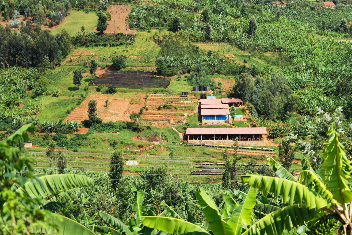 The majority of the coffee grown in Rwanda comes from Reb Bourbon trees grown on small hold farms and delivered to a local washing station for processing. The picture on the shows the Bwishaza washing station surrounded by farms that include coffee, bananas, cassava and other essential crops.