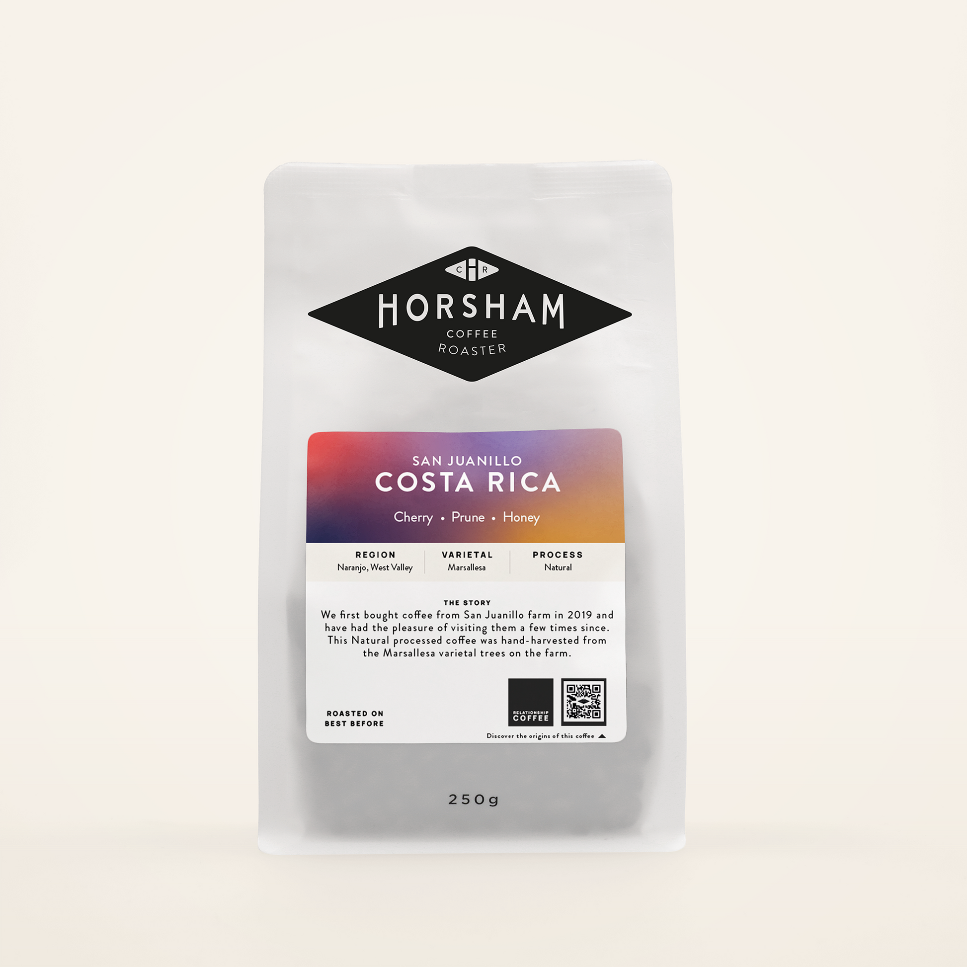 Our Costa Rican coffees are sourced directly by us from several dedicated, small producers. We've been buying this stunning natural processed Marsellesa varietal coffee from San Juanillo for 5 years.