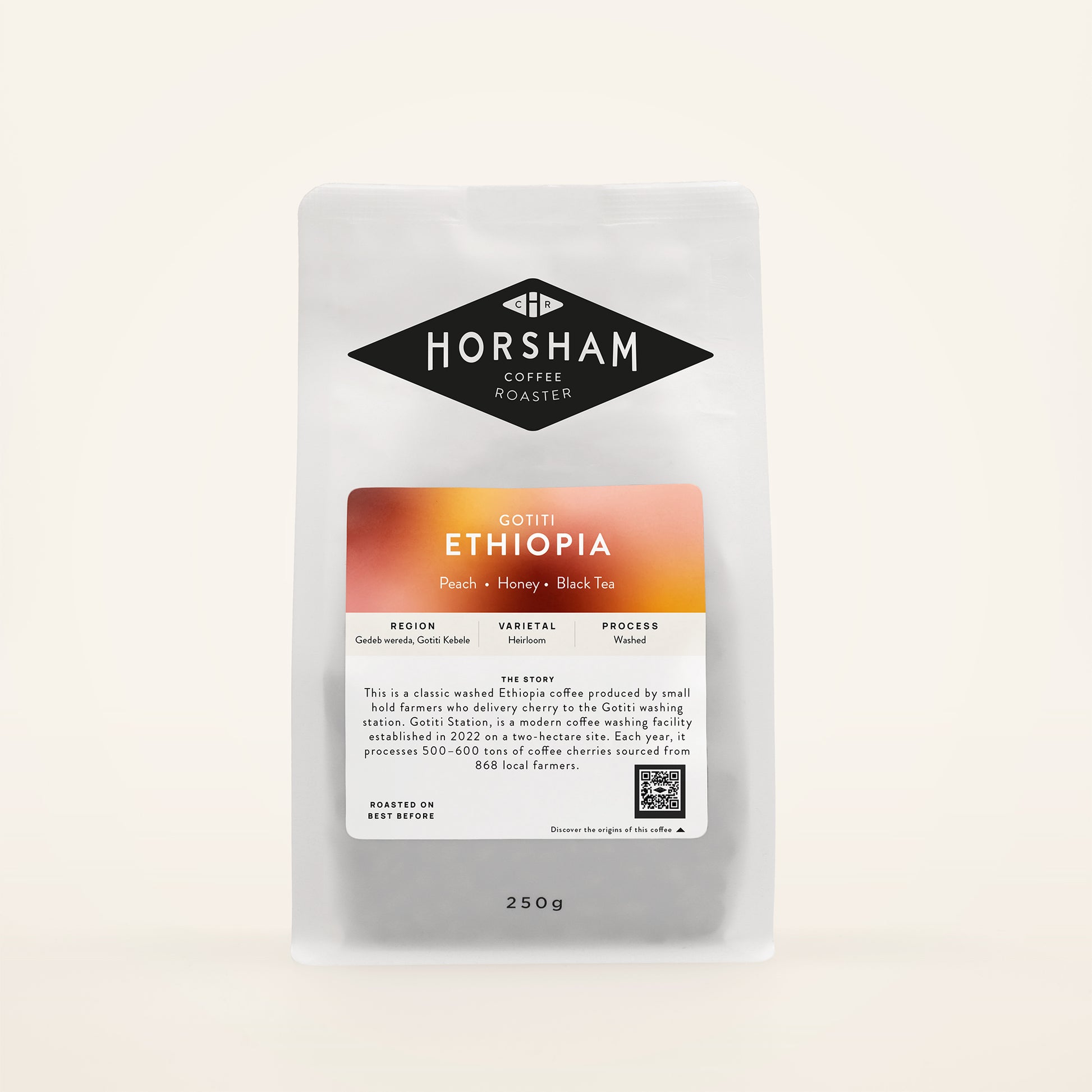 This is a classic washed Ethiopia coffee produced by small hold farmers who delivery cherry to the Gotiti washing station. Tasting notes include Peach, honey and black tea.